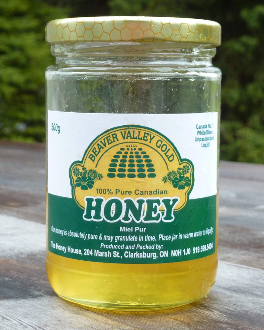 As we walked along the main street of Collingwood I noticed a shop called, Wheat & Honey Natural Health Foods. Naturally I checked it out. I hoped to learn more about the local honey and I wasn’t disappointed. They had a small selection of honey including a jar of “Beaver Valley Gold” from “The Honey House”. The Honey House was a short drive away in Clarksburg just west of Collingwood. I bought the jar shown here and got directions. Unfortunately they thought it was probably closed, only being open later in the week this time of the year—we would be headed back home before then… Nevertheless, the Clarksburg area seemed as good a target as any for our exploratory drive the next day. Our resolve was sweetened once we tasted the honey—it was delicious! If you look carefully you can see we had eaten more than half the jar by the time the photo was taken a couple of days later!