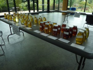 Thirteen entries. The first batch judged was the light, then amber and dark honeys. Initial observations were written on cards for each entry. Once all criteria was measured, the data was transferred to scorecard and added up.