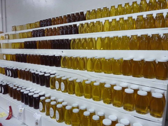 The fair was bigger than I’d imagined. It took me quite a while to find the building where the honey competition had been held, but once inside, the display of honey competitors was impressive. The darker honeys are grouped in the amber category and the light honey in the light category.